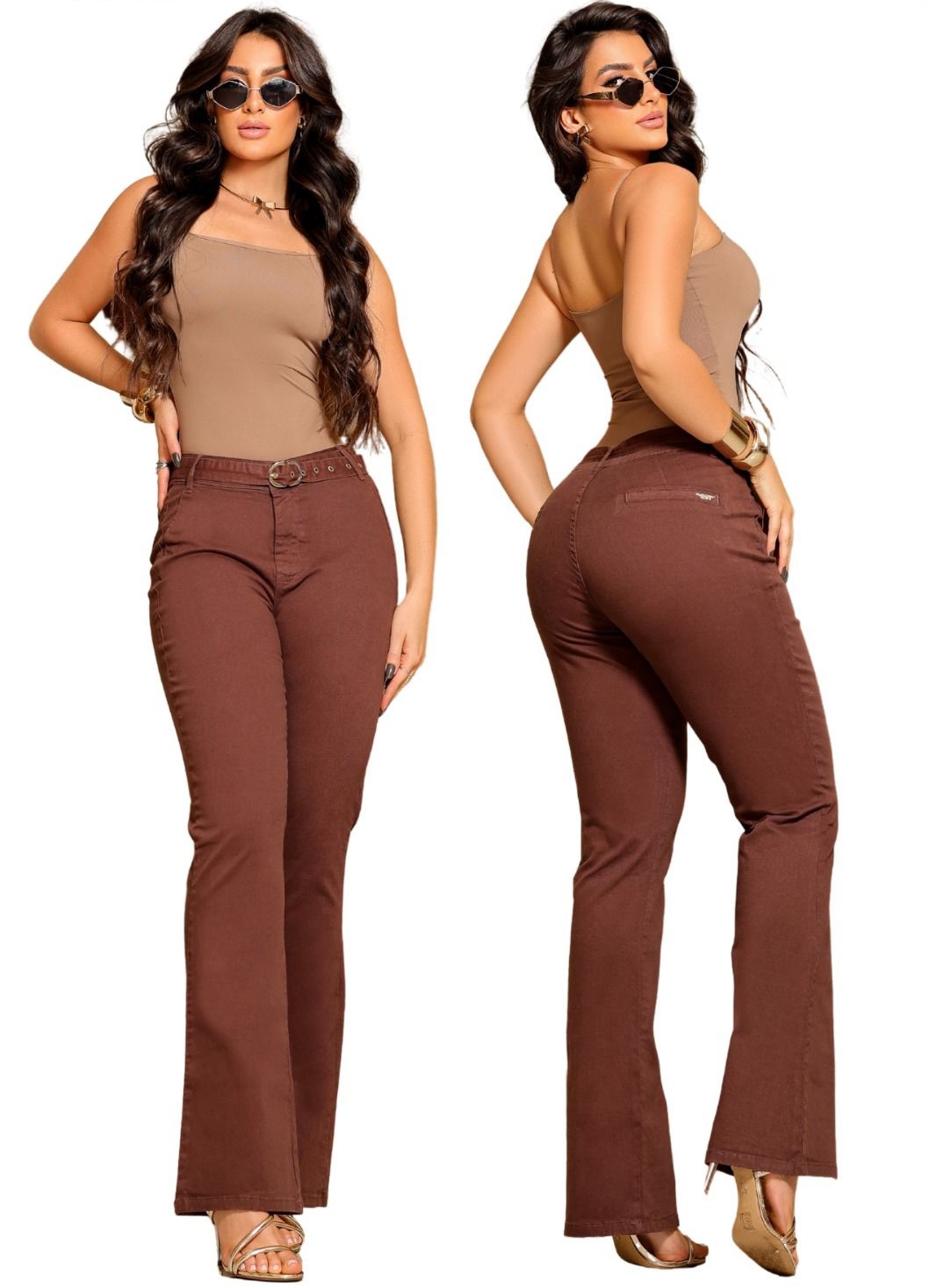 Calça boot cut em ponto citera chocolate, cintura alta com boca alargada. Cinto incluso. Ref. CBPT100894 — Empório Rosa.
